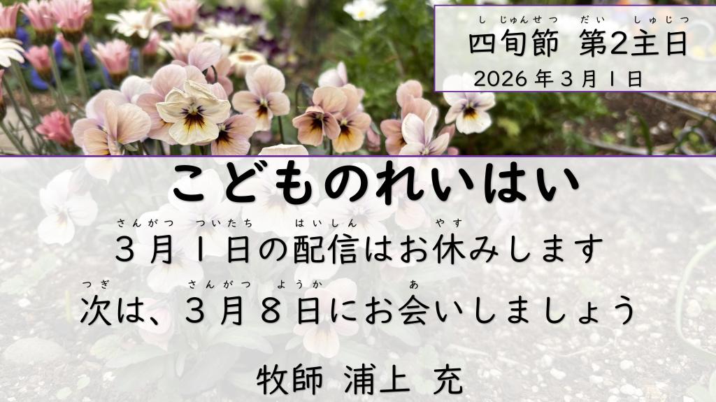 こどものれいはい <オンライン> <次回の礼拝> No.47 こどものれいはい<おんらいん> 週報 2026.02.22 四旬節 第1主日ダウンロード ++++++++++++++++++++++++++++++++++++++++ <先週の礼拝> No.46 こどものれいはい<おんらいん> 週報 2026.02.15 主の変容ダウンロード